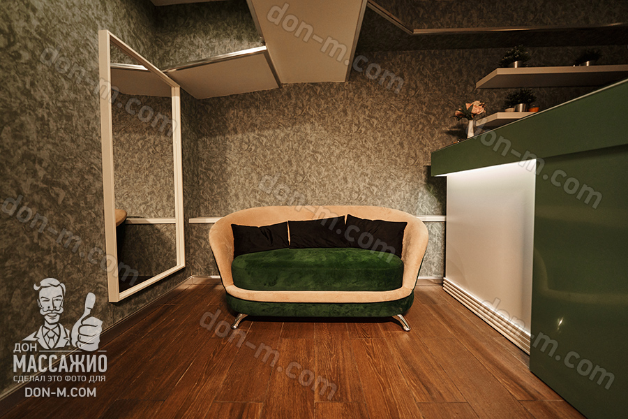 Своей очереди на массаж можно подождать на диванчике, на нем же и переобуться. Я, недолго думая, сразу же запрыгнул в тапочки и отправил зимний мундир с начесом в шкафчик, чтобы с порога погрузиться в полудомашнюю атмосферу ;) Поинтересовался у админа: можно ли не переобуваться в теплую сухую погоду? Говорит – можно. Посмотрим, что будет летом, но на декабрь это точно не распространяется.