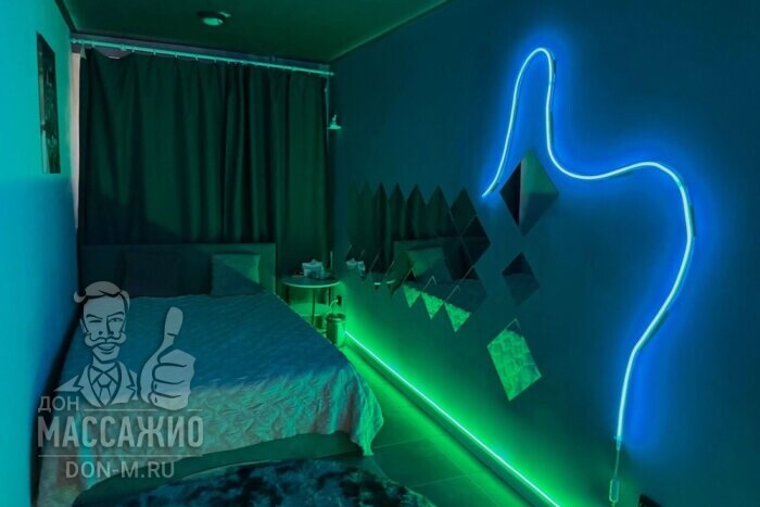 Для салона эротического массажа «Elite man's» размера образцового – шесть комнат. Буквально золотая середина) Ну и интерьер под стать: без особого апломба, но выдержан в едином стиле и старается порадовать симпатичными мелочами, вроде искусственных цветов или светодиодной ленты по углам.