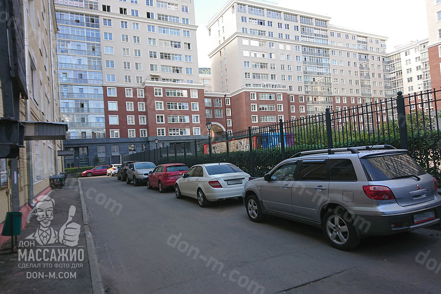 Дорога ничем от пешей не отличается – впрочем, от поездок по тротуарам я бы воздержался, – но путь во дворы со стороны кафе (да и со стороны Промсвязьбанка по соседству) преграждает шлагбаум. Паркинг придется выискивать на лицевой стороне улицы, но в моей визит мест хватало. Хотя внутри тоже стоят машины, но, подозреваю, это для внутреннего пользования: