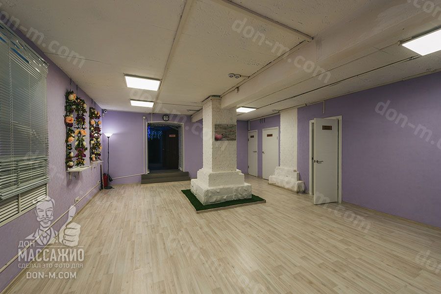 На мой немой вопрос админ непосредственно пожала плечами и заверила, что мебельные перестановки у салона «в планах», а пока так – простор, приятная акустика и гордая несущая колонна. «Нет, ну это не дело! – возмутился я. – Надо поддать жару!». Сказано – сделано, и пустоватый зал украшает собой игривая массажистка: