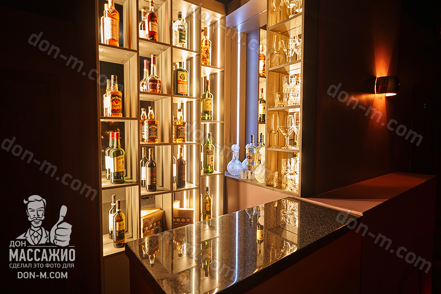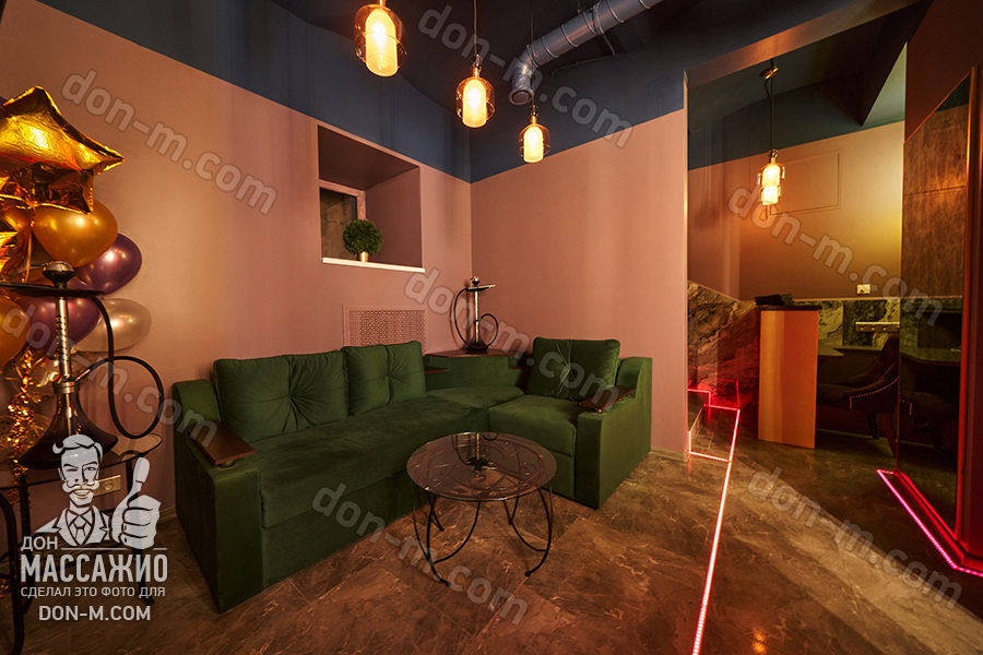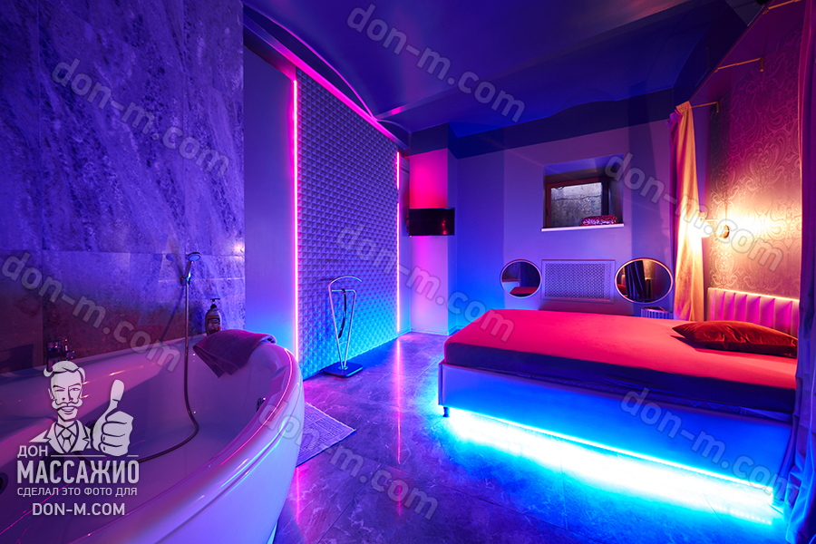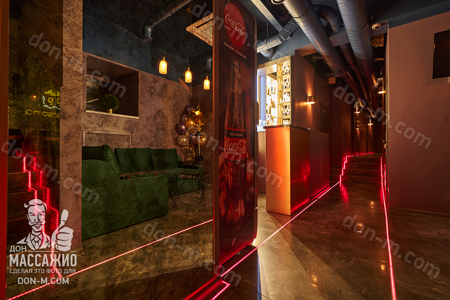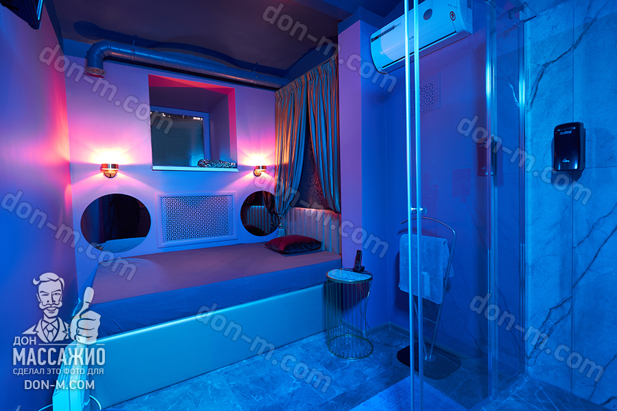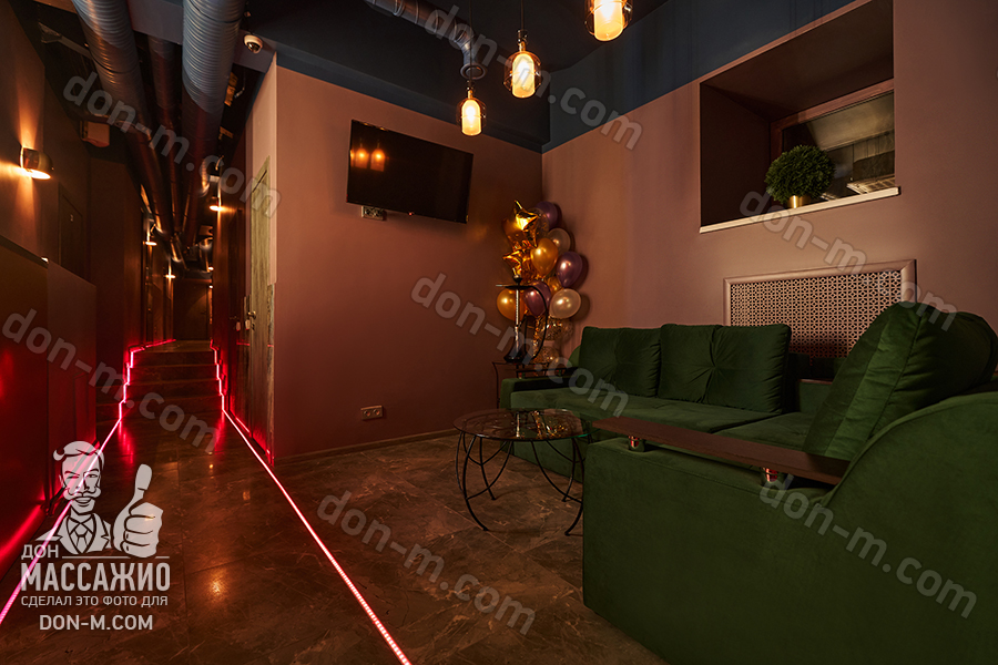 В остальном обычные комнаты мало чем отличаются от «випок», а стилистически все массажные и вовсе пришли к некоторому единообразию. Скучным его, впрочем, не назовешь, что в значительной мере заслуга освещения. На неон в «Персоне» не поскупились, но слишком кислотным не сделали: