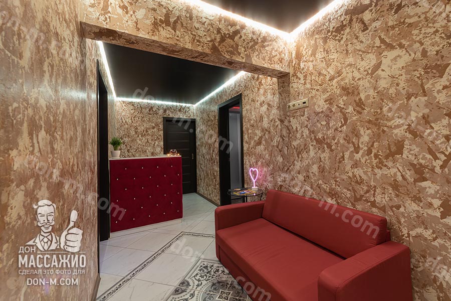 «Velvet Hands» с порога, не стесняясь заявляет, что здесь салон эротического массажа, а не что-нибудь еще: сочетание красных и белых тонов, игривое сердечко на столе, обитая вельветом стойка рецепции.