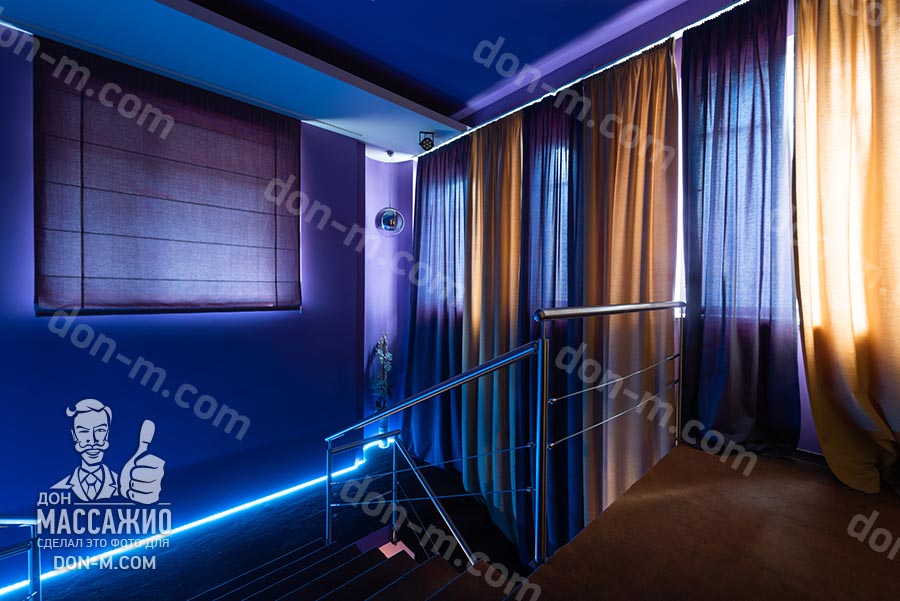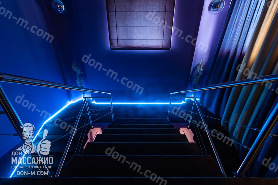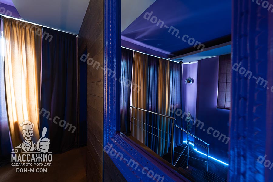 Сразу после входа меня встречает шикарная лестница и масса синего цвета в интерьере. Вообще, атмосфера приятная с самого начала, особенно, если заглянуть в салон посреди лета. Всего у лестницы три пролета, на втором она красиво расходится, а в конце снова соединяется в единый проход. Если мечтали когда-нибудь торжественно зайти на массаж, как в бальный зал, то вам точно сюда.